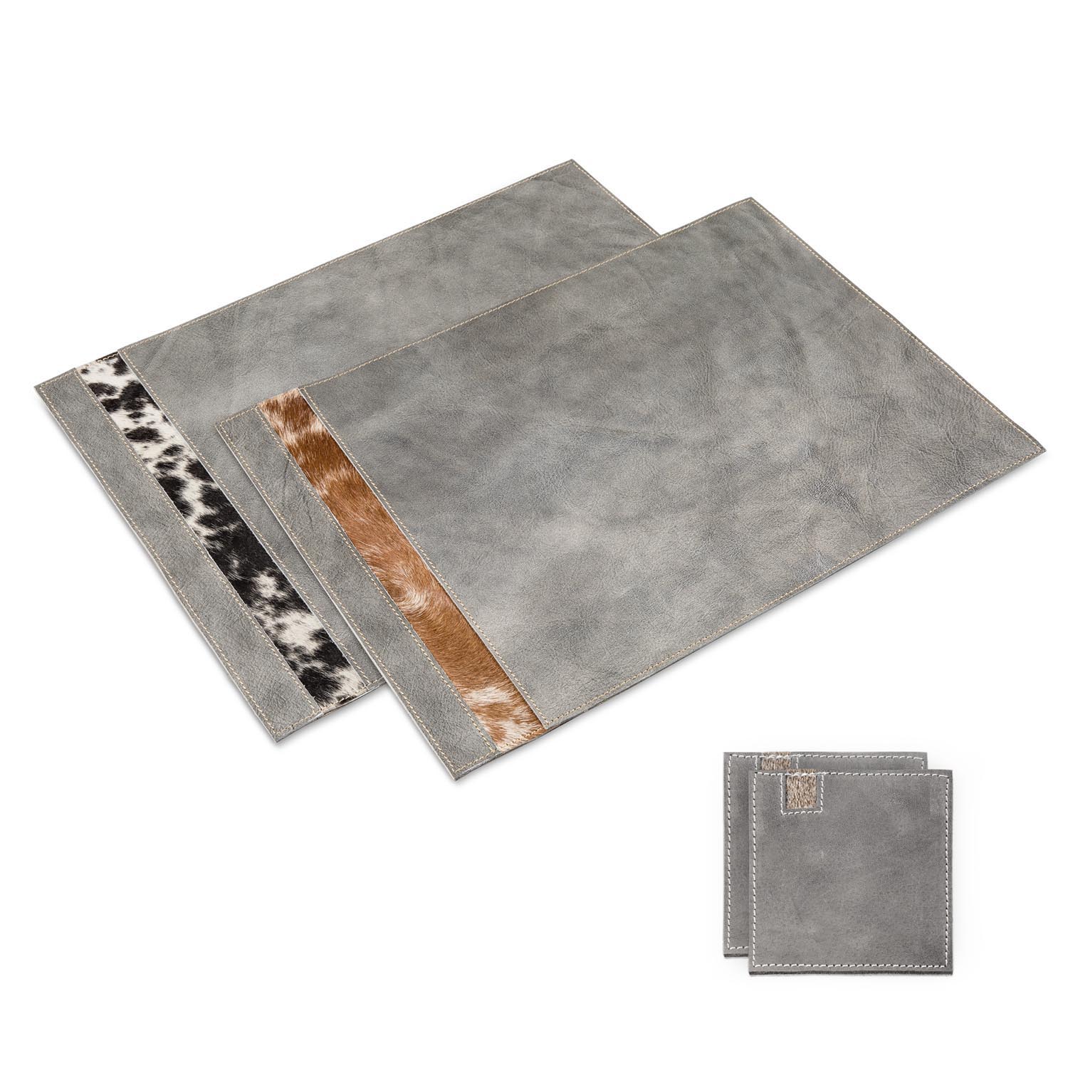 Das Set besteht aus zwei Platzsets sowie zwei Glasuntersetzern, wobei jedes Stück durch die echte Kuhfell-Applikation zu einem wunderschönen Unikat wird.